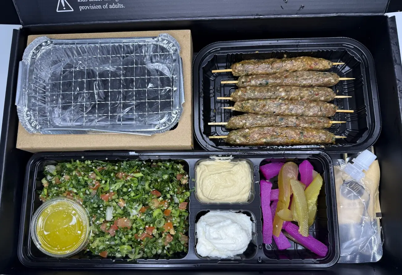Jede Box enthält deine Wahl an Signature Kefta, marinierten Hühner- oder Lammspießen, zusammen mit: